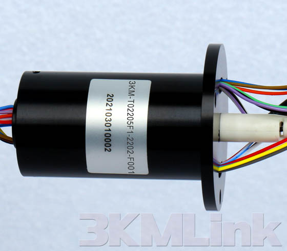 3KM T-series slip ring is designed with a through hole for shaft mounting, the through hole sizes are from 12.7mm to 124.6mm. it could be applied to transmit power, signals, RF, gas and fluid when the devices require 360° rotating.